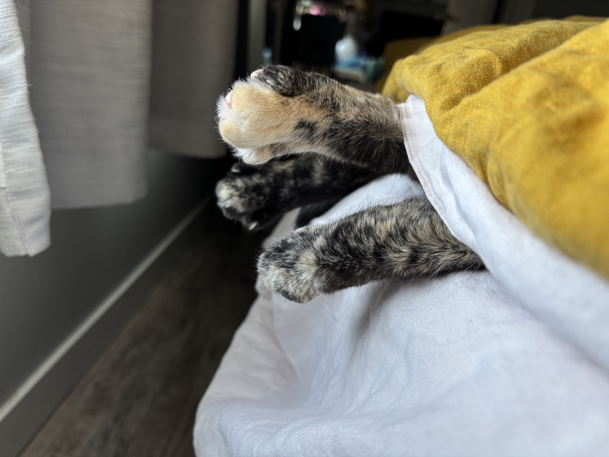 I made a bed for June on top of that IKEA cart that everyone has so she'd stop stomping on my keyboard during the workday and lo, it worked a treat.Have you ever seen cat feet? omg