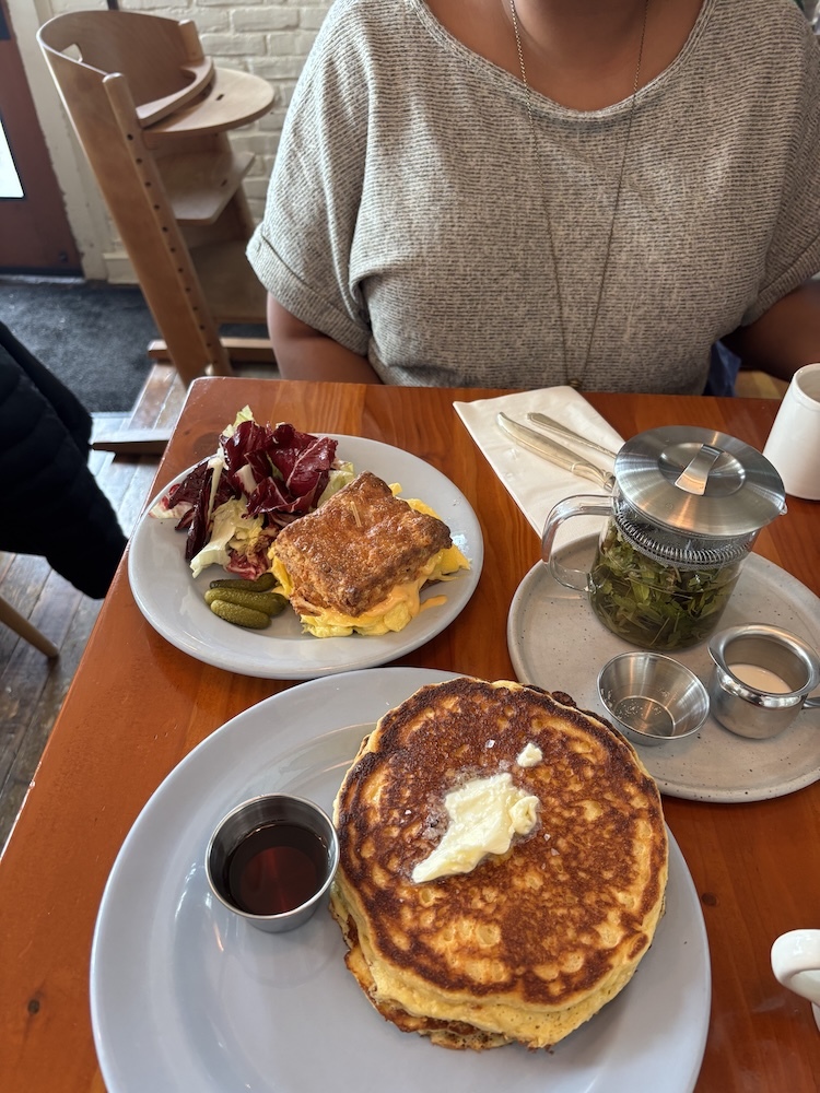 Celebrating over 21 years of whatever this is in an extremely humid room!!Baby's first birthday corn cakes at Sweedeedee good lord.